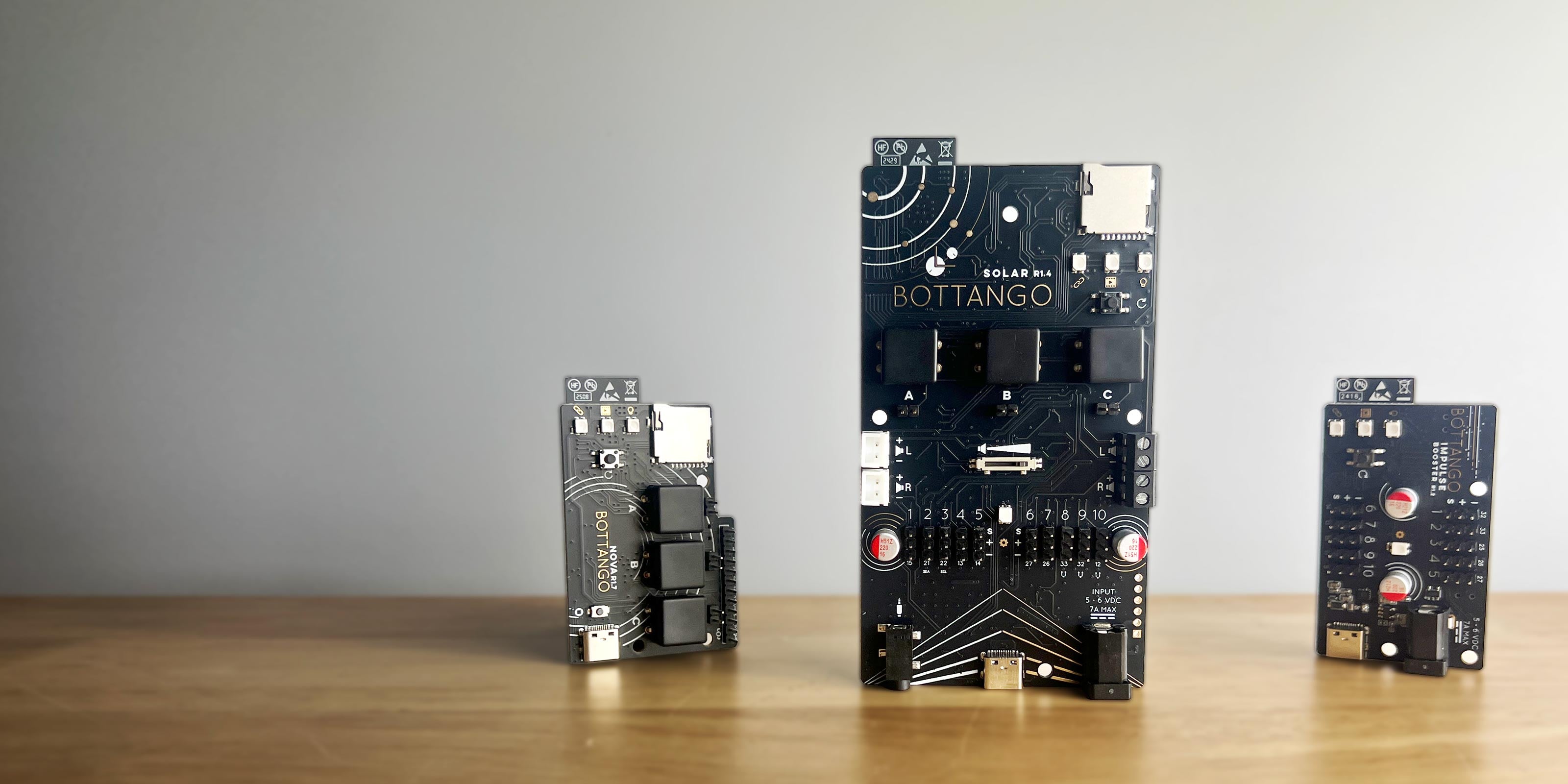 Made to work together. You can designate one board as a low-latency wireless “bridge,” connected to your computer, while the rest of your boards link wirelessly through it. Want to go computer-free? Export animation data directly to the bridge and let it act as a standalone show controller for all connected boards. Bottango Nova is purpose-built to be the perfect bridge and show controller, but any board in the lineup can take on that role.